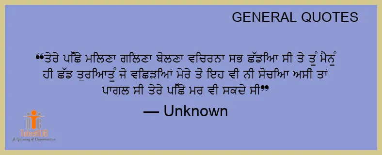 ਤੇਰੇ ਪਿੱਛੇ ਮਿਲਣਾ ਗਿਲਣਾ ਬੋਲਣਾ ਵਿਚਰਨਾ ਸਭ ਛੱਡਿਆ ਸੀ ਤੇ ਤੂੰ ਮੈਨੂੰ ਹੀ ਛੱਡ ਤੁਰਿਆਤੂੰ ਜੋ ਵਿਛੜਿਆਂ ਮੇਰੇ ਤੋਂ ਇਹ ਵੀ ਨੀ ਸੋਚਿਆ ਅਸੀਂ ਤਾਂ ਪਾਗਲ ਸੀ ਤੇਰੇ ਪਿੱਛੇ ਮਰ ਵੀ ਸਕਦੇ ਸੀ