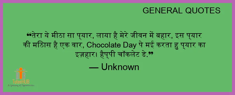 तेरा ये मीठा सा प्यार, लाया है मेरे जीवन में बहार, इस प्यार की मिठास है एक वार, CHOCOLATE Day पे मई करता हु प्यार का इज़हार। हैप्पी चॉकलेट डे.