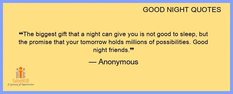 The biggest gift that a night can give you is not good to sleep, but the promise that your tomorrow holds millions of possibilities. Good night friends.