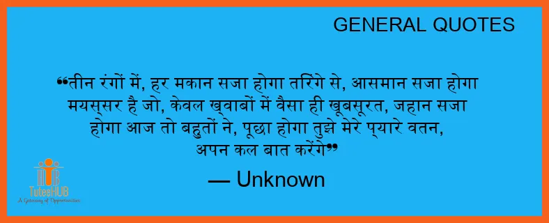 तीन रंगों में, हर मकान सजा होगा तिरंगे से, आसमान सजा होगा मयस्सर है जो, केवल ख्वाबों में वैसा ही खूबसूरत, जहान सजा होगा आज तो बहुतों ने, पूछा होगा तुझे मेरे प्यारे वतन, अपन कल बात करेंगे