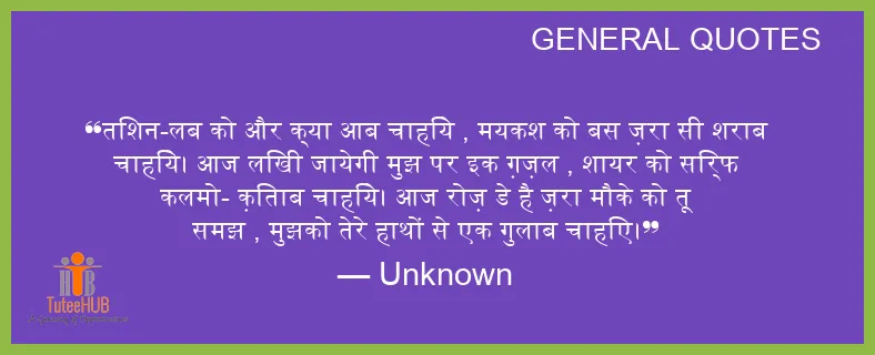 तिशन-लब को और क्या आब चाहिये , मयकश को बस ज़रा सी शराब चाहिये। आज लिखी जायेगी मुझ पर इक ग़ज़ल , शायर को सिर्फ कलमो- क़िताब चाहिये। आज रोज़ डे है ज़रा मौके को तू समझ , मुझको तेरे हाथों से एक गुलाब चाहिए।