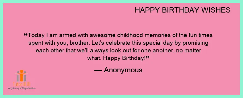Today I am armed with awesome childhood memories of the fun times spent with you, brother. Let’s celebrate this special day by promising each other that we’ll always look out for one another, no matter what. Happy Birthday!
