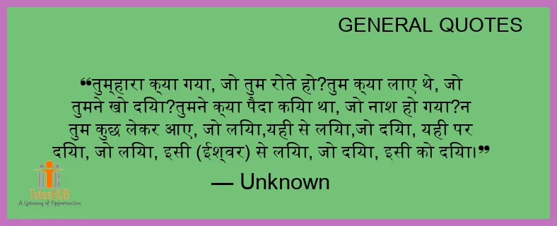 तुम्हारा क्या गया, जो तुम रोते हो?तुम क्या लाए थे, जो तुमने खो दिया?तुमने क्या पैदा किया था, जो नाश हो गया?न तुम कुछ लेकर आए, जो लिया,यही से लिया,जो दिया, यही पर दिया, जो लिया, इसी (ईश्वर) से लिया, जो दिया, इसी को दिया।