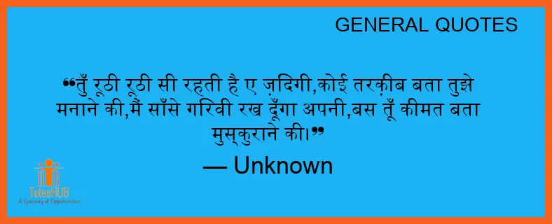 तुँ रूठी रूठी सी रहती है ए ज़िंदगी,कोई तरक़ीब बता तुझे मनाने की,मैं साँसे गिरवी रख दूँगा अपनी,बस तूँ कीमत बता मुस्कुराने की।