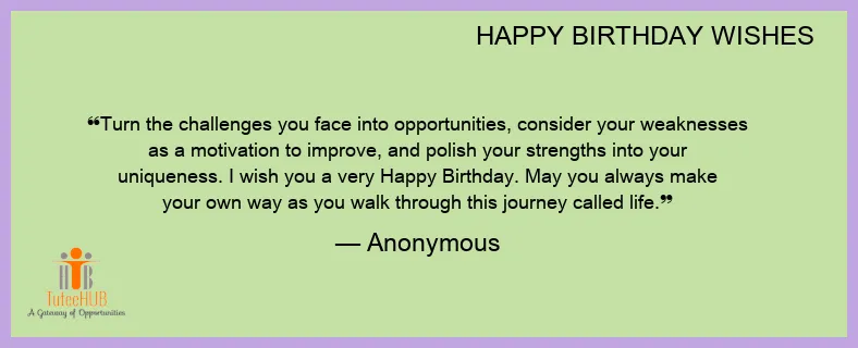 Turn the challenges you face into opportunities, consider your weaknesses as a motivation to improve, and polish your strengths into your uniqueness. I wish you a very Happy Birthday. May you always make your own way as you walk through this journey called life.