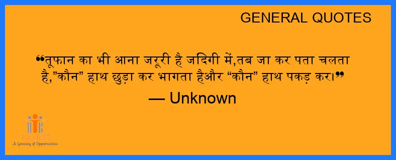 तूफान का भी आना जरूरी है जिंदगी में,तब जा कर पता चलता है,”कौन” हाथ छुड़ा कर भागता हैऔर “कौन” हाथ पकड़ कर।