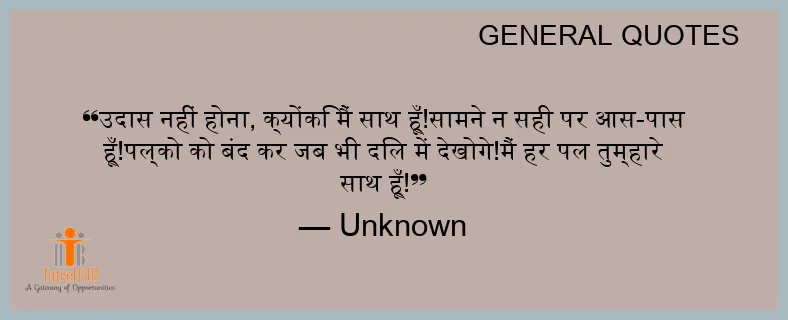 उदास नहीं होना, क्योंकि मैं साथ हूँ!सामने न सही पर आस-पास हूँ!पल्को को बंद कर जब भी दिल में देखोगे!मैं हर पल तुम्हारे साथ हूँ!