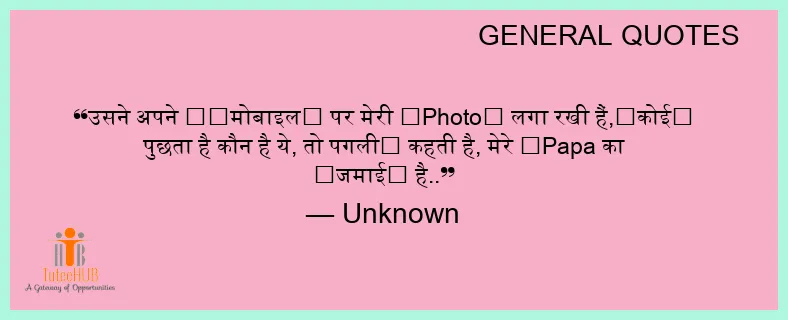 उसने अपने ‪‎मोबाइल‬ पर मेरी ‪Photo‬ लगा रखी हैं,‎कोई‬ पुछता है कौन है ये, तो पगली‬ कहती है, मेरे ‎Papa का ‪जमाई‬ है..