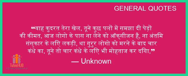 वाह कुदरत तेरा खेल, तूने कुछ पलों में समझा दी पेड़ों की कीमत, आज लोगो के पास ना लेने को ऑक्सीजन हैं, ना अंतिम संस्कार के लिए लकड़ी, था गुरुर लोगो को मरने के बाद चार कंधे का, तूने तो चार कंधे के लिए भी मोहताज कर दिया,