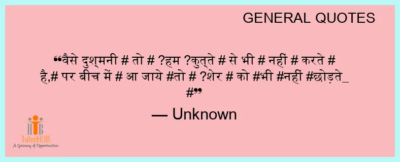वैसे दुश्मनी # तो # ?हम ?कुत्ते # से भी # नहीं # करते # है,# पर बीच में # आ जाये #तो # ?शेर # को #भी #नहीं #छोड़ते_ #