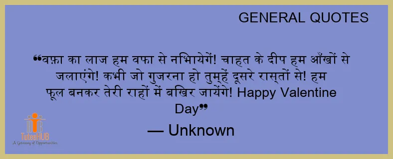 वफ़ा का लाज हम वफा से निभायेगें! चाहत के दीप हम आँखों से जलाएंगे! कभी जो गुजरना हो तुम्हें दूसरे रास्तों से! हम फूल बनकर तेरी राहों में बिखर जायेंगे! HAPPY Valentine Day