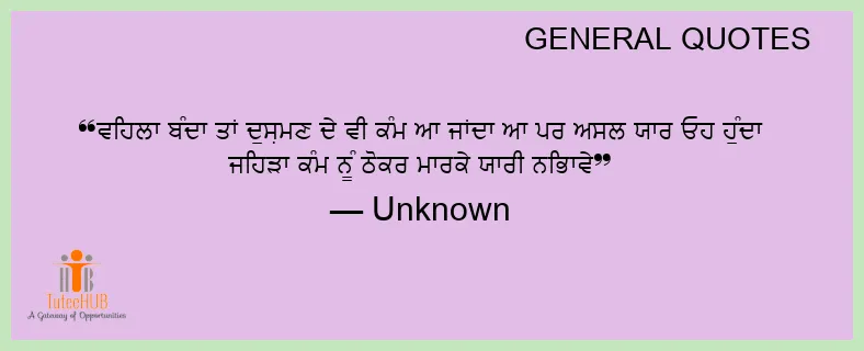 ਵਿਹਲਾ ਬੰਦਾ ਤਾਂ ਦੁਸ਼ਮਣ ਦੇ ਵੀ ਕੰਮ ਆ ਜਾਂਦਾ ਆ ਪਰ ਅਸਲ ਯਾਰ ਓਹ ਹੁੰਦਾ ਜਿਹੜਾ ਕੰਮ ਨੂੰ ਠੋਕਰ ਮਾਰਕੇ ਯਾਰੀ ਨਿਭਾਵੇ