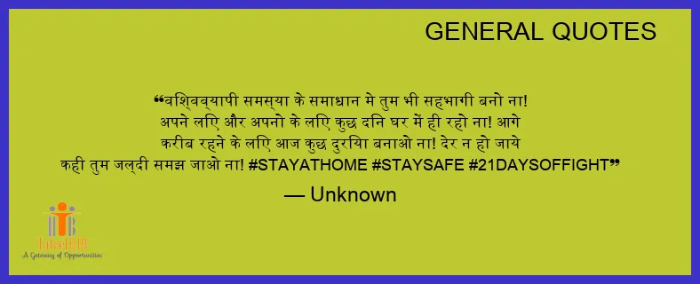 विश्वव्यापी समस्या के समाधान मे तुम भी सहभागी बनो ना! अपने लिए और अपनो के लिए कुछ दिन घर में ही रहो ना! आगे करीब रहने के लिए आज कुछ दुरिया बनाओ ना! देर न हो जाये कही तुम जल्दी समझ जाओ ना! #STAYATHOME #STAYSAFE #21DAYSOFFIGHT