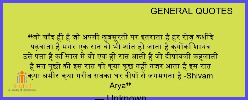 वो चाँद ही है जो अपनी खुबसूरती पर इतराता है हर रोज़ कशीदे पढ़वाता है मगर एक रात वो भी शांत हो जाता है क्योंकि शायद उसे पता है कि साल में वो एक ही रात आती है जो दीपावली कहलाती है मत पूछो की इस रात को क्या कुछ नहीं नज़र आता है इस रात क्या अमीर क्या गरीब सबका घर दीपों से जगमगता है -Shivam Arya
