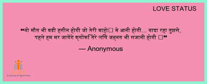 वो मौत भी बडी हसीन होगी जो तेरी बाहो👰 मे आनी होगी… वादा रहा तुझसे, पहले हम मर जायेंगे क्योंकि तेरे लिये जऩ्नत भी सजानी होगी 😍