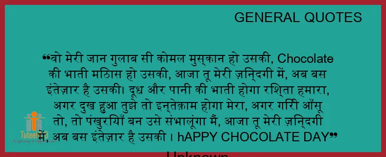 वो मेरी जान गुलाब सी कोमल मुस्कान हो उसकी, CHOCOLATE की भाती मिठास हो उसकी, आजा तू मेरी ज़िन्दगी में, अब बस इंतेज़ार है उसकी। दूध और पानी की भाती होगा रिश्ता हमारा, अगर दुख हुआ तुझे तो इन्तेक़ाम होगा मेरा, अगर गिरी आँसू तो, तो पंखुरियाँ बन उसे संभालूंगा मैं, आजा तू मेरी ज़िन्दगी में, अब बस इंतेज़ार है उसकी । hAPPY CHOCOLATE DAY
