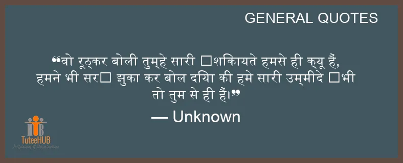 वो रूठ्कर बोली तुम्हे सारी ‎शिकायते हमसे ही क्यू हैं, हमने भी सर‬ झुका कर बोल दिया की हमे सारी उम्मीदे ‬भी तो तुम से ही हैं।