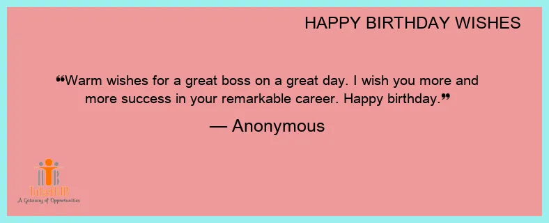 Warm wishes for a great boss on a great day. I wish you more and more success in your remarkable career. Happy birthday.