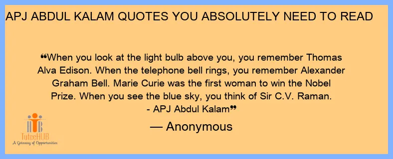 When you look at the light bulb above you, you remember Thomas Alva Edison. When the telephone bell rings, you remember Alexander Graham Bell. Marie Curie was the first woman to win the Nobel Prize. When you see the blue sky, you think of Sir C.V. Raman. - APJ Abdul Kalam