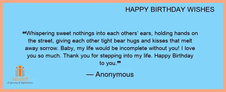 Whispering sweet nothings into each others’ ears, holding hands on the street, giving each other tight bear hugs and kisses that melt away sorrow. Baby, my life would be incomplete without you! I love you so much. Thank you for stepping into my life. Happy Birthday to you.