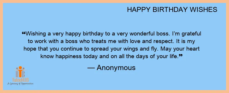 Wishing a very happy birthday to a very wonderful boss. I’m grateful to work with a boss who treats me with love and respect. It is my hope that you continue to spread your wings and fly. May your heart know happiness today and on all the days of your life.