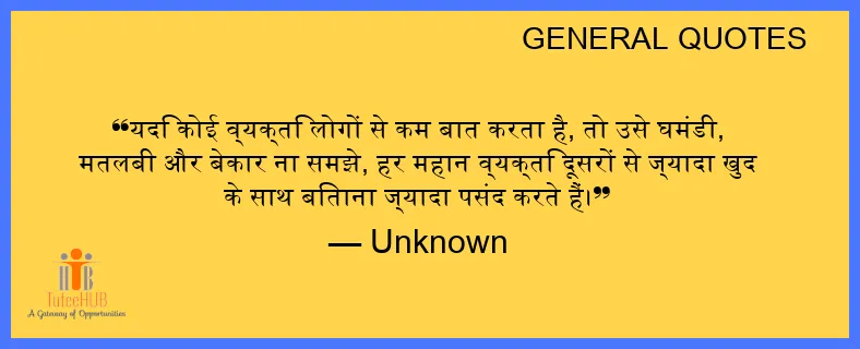 यदि कोई व्यक्ति लोगों से कम बात करता है, तो उसे घमंडी, मतलबी और बेकार ना समझे, हर महान व्यक्ति दूसरों से ज्यादा खुद के साथ बिताना ज्यादा पसंद करते हैं।