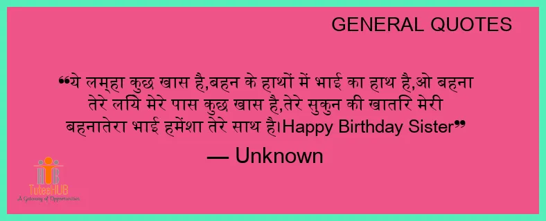 ये लम्हा कुछ खास है,बहन के हाथों में भाई का हाथ है,ओ बहना तेरे लिये मेरे पास कुछ खास है,तेरे सुकुन की खातिर मेरी बहनातेरा भाई हमेंशा तेरे साथ है।Happy BIRTHDAY Sister