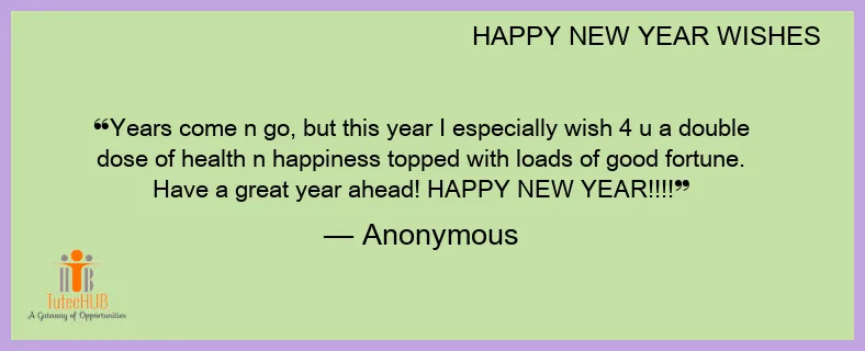 Years come n go, but this year I especially wish 4 u a double dose of health n happiness topped with loads of good fortune. Have a great year ahead! HAPPY NEW YEAR!!!!