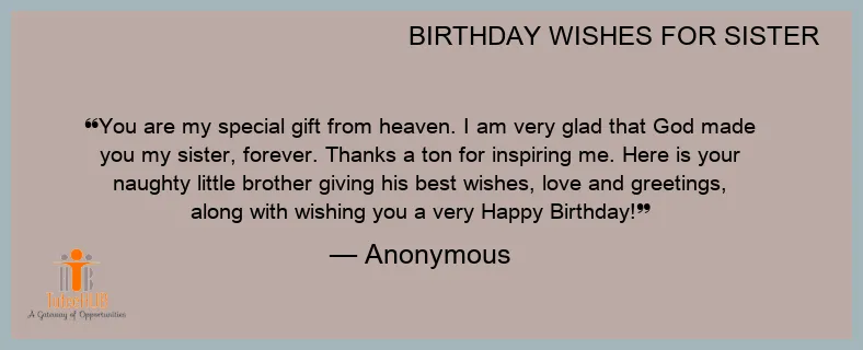 You are my special gift from heaven. I am very glad that God made you my sister, forever. Thanks a ton for inspiring me. Here is your naughty little brother giving his best wishes, love and greetings, along with wishing you a very Happy Birthday!