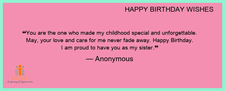 You are the one who made my childhood special and unforgettable. May, your love and care for me never fade away. Happy Birthday. I am proud to have you as my sister.