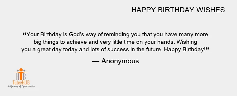 Your Birthday is God’s way of reminding you that you have many more big things to achieve and very little time on your hands. Wishing you a great day today and lots of success in the future. Happy Birthday!