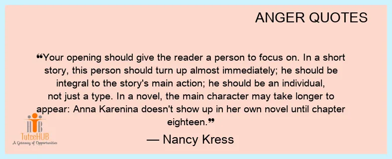 Your opening should give the reader a PERSON to focus on. In a SHORT story, this person should TURN up almost immediately; he should be integral to the story's MAIN action; he should be an individual, not just a type. In a novel, the main character MAY take longer to appear: Anna Karenina doesn't show up in her own novel until chapter eighteen.