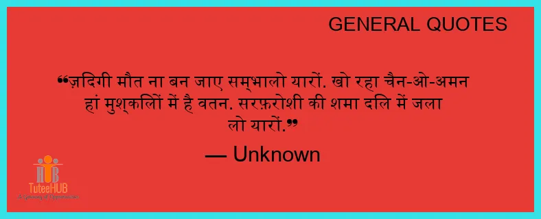 ज़िंदगी मौत ना बन जाए सम्भालो यारों. खो रहा चैन-ओ-अमन हां मुश्किलों में है वतन. सरफ़रोशी की शमा दिल में जला लो यारों.