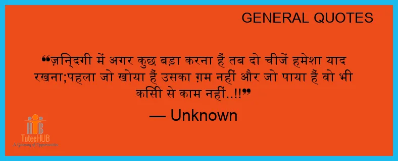 ज़िन्दगी में अगर कुछ बड़ा करना हैं तब दो चीजें हमेशा याद रखना;पहला जो खोया हैं उसका ग़म नहीं और जो पाया हैं वो भी किसी से काम नहीं..!!